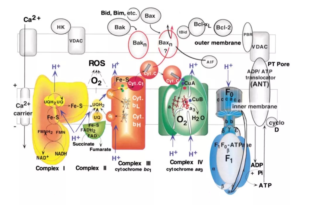 線粒體是真核生物的“能量工廠”,以及糖類、脂肪和氨基酸氧化釋放能量的場所。有氧呼吸的核心環(huán)節(jié)——三羧酸循環(huán)在線粒體基質中完成,通過氧化磷酸化利用期間生成的還原型煙酰胺腺嘌呤二核苷酸(NADH)和還原型黃素腺嘌呤二核苷酸(FADH2)等高能分子轉移電子與質子,積累電化學勢差,還原氧氣,制造三磷酸腺苷(ATP)。ATP是細胞的直接能量來源,含有高能磷酸鍵,極不穩(wěn)定。線粒體能夠檢測并響應氧氣水平,低氧被感應后可以引發(fā)一系列適應性反應,并激活低氧誘導因子(HIF)。如線粒體復合物III的泛醌循環(huán)可響應缺氧而產(chǎn)生活性氧(ROS),從而穩(wěn)定HIF alpha蛋白。
