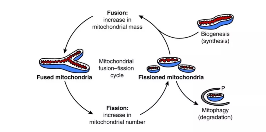 線粒體實際上是一個互聯(lián)系統(tǒng),通過融合和分裂動態(tài)調節(jié)自身形態(tài)和功能,維持mtDNA完整性、電和生化連通性,以及周轉、分離或保護。其動態(tài)平衡有助于線粒體質量控制——融合允許在完整的和功能異常的線粒體之間進行信號傳遞和內容物交換等相互聯(lián)系,替換受損的mtDNA,以促進線粒體完整性,并在細胞內提供質量均勻的線粒體群體;分裂允許分離不可逆損傷及功能缺陷的線粒體,并通過線粒體自噬或程序性細胞死亡過程將其清除。