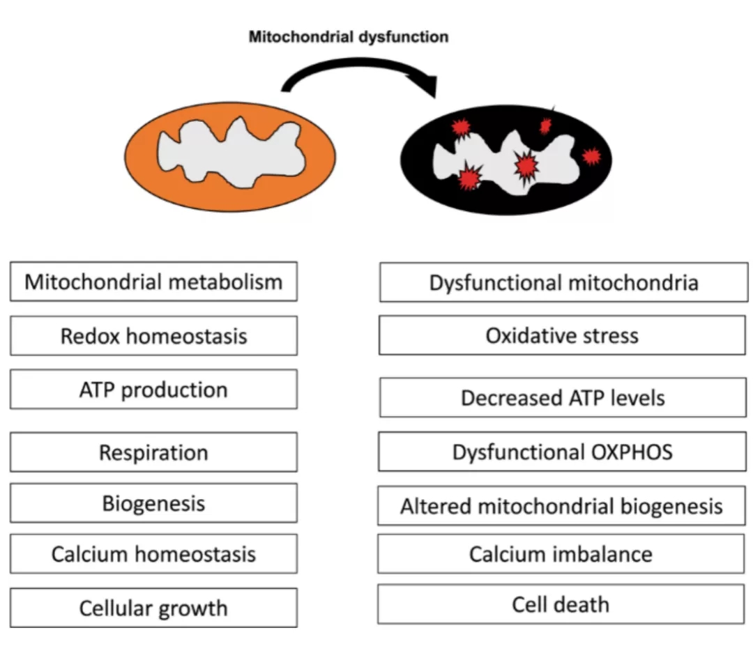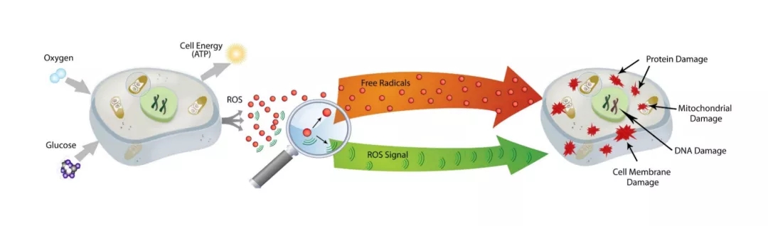 線粒體直接利用氧氣制造能量,而大量電子總會在高氧環(huán)境和高還原態(tài)的呼吸鏈中泄漏,產(chǎn)生多種氧化磷酸化的天然副產(chǎn)物——氧的單電子還原產(chǎn)物,如超氧陰離子、單線態(tài)氧、過氧化物等,統(tǒng)稱活性氧(ROS)。過量ROS與自由基泄漏到線粒體外進入細胞及胞外,將電子傳遞給其他分子,對人體造成的氧化損害,稱為氧化應激。事實上,線粒體正常代謝產(chǎn)生的適量ROS作為信號分子具有重要生理作用,而過量攝入外源性抗氧化劑可造成機體對ROS信號不敏感,導致低效線粒體無法及時清除,反而引發(fā)ATP長期不足,加速衰老。因此,減少氧化損害更重要的是減少自由基的內源性產(chǎn)生,提升線粒體自身抗氧化能力,而非一味補充外源性抗氧化劑。