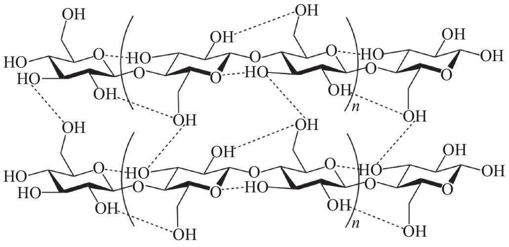 纖維素大分子的基環(huán)是D-葡萄糖以β-1,4糖苷鍵組成的大分子多糖,見圖4.由于纖維素特殊的構(gòu)型,纖維素的分子與分子之間的-OH都形成了氫鍵,使之無法溶于水,所以我們?nèi)粘V惺褂玫降闹饕囚燃谆w維素鈉、羥乙基纖維素、羥丙基纖維素等經(jīng)過改性的纖維素,使之溶于水。