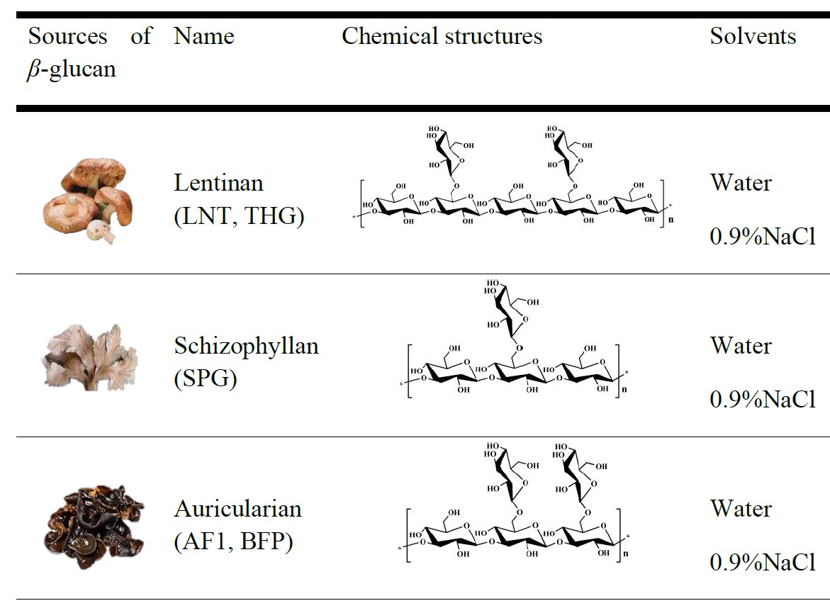 表 1. 溶液中幾種三螺旋β-(1,3)-D-葡聚糖的來源和化學(xué)結(jié)構(gòu)