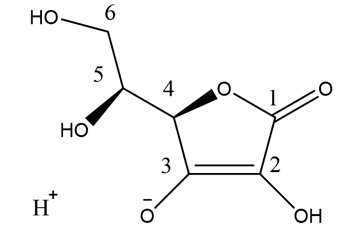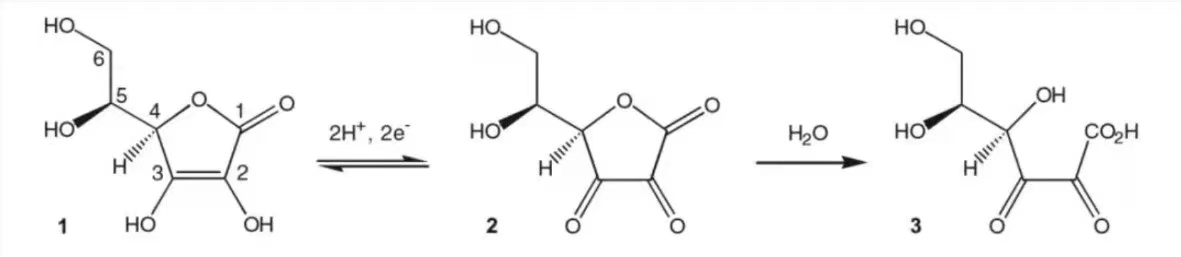 Vc具有比較強的酸性,主要是2,3號位的-OH電離出氫(可能主要是3號位,不一定準確),生成氧負離子,進一步增加了體系的電荷密度,因而容易被氧化。Vc的pKa為4.17,如果要保持90%的分子形態(tài),pH需要到3.17,所以我們經(jīng)常聽到原型Vc需要使pH低于3.5或者3.0,會更穩(wěn)定一些,原因就是如此。