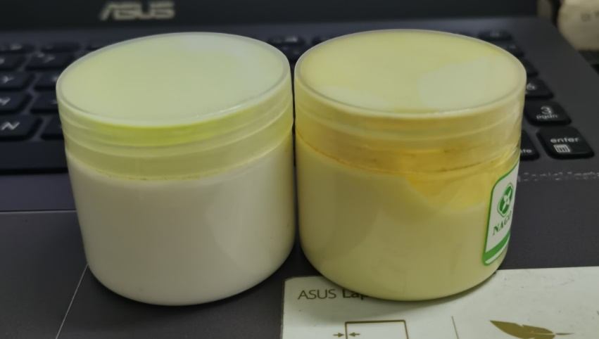 圖2. 左邊是將4-丁基間苯二酚引入吸電基之后的成分做的霜,右邊是4-丁基間苯二酚做的配方