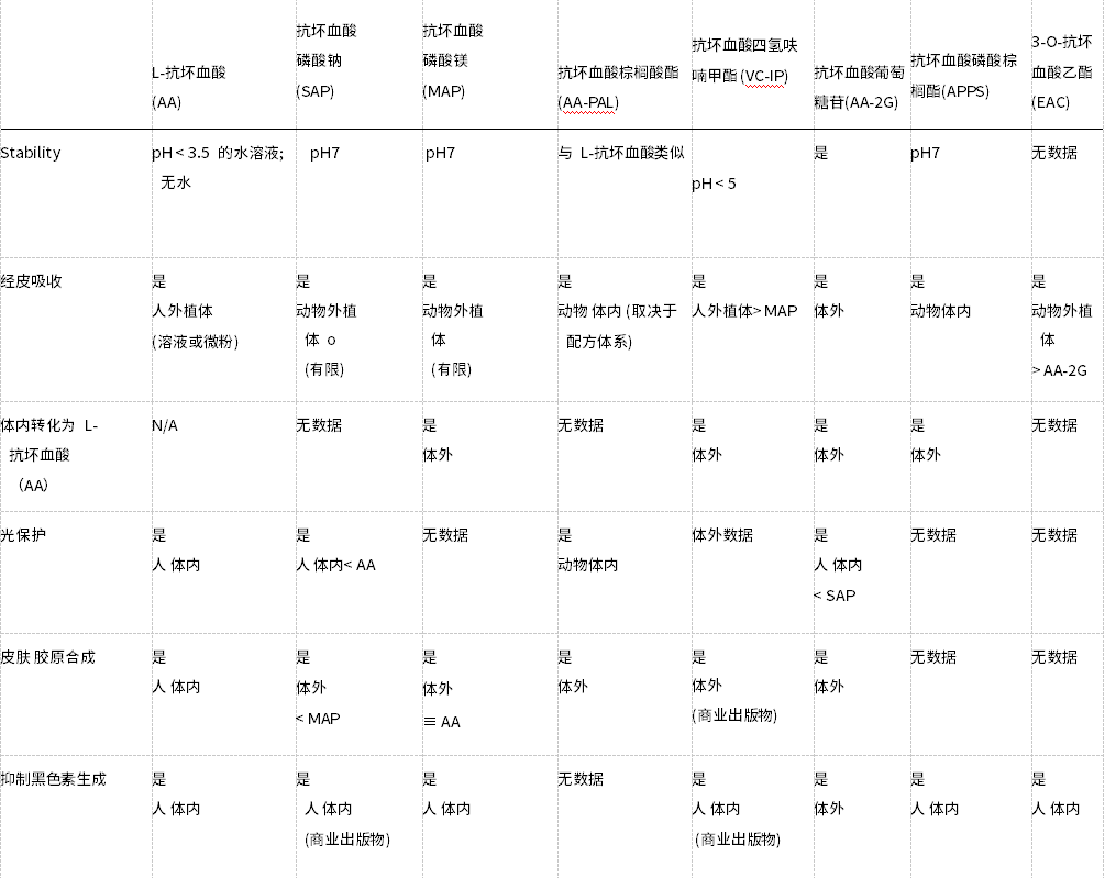 表1. 不同Vc衍生物的特性以及功效驗證