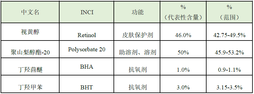 其實以巴斯夫的研究水平來說,絕對是全球領先,Va醇的原料不論帝斯曼還是國內(nèi)環(huán)聚(我司代理)、迪克曼、克琴等都是模仿者,其組成比例如表2. Va醇大約含量46%,含有50%的吐溫20,BHA+BHT作為油溶性抗氧化劑,與Va醇能很好的相容,在護膚品的氧化變色(一)——油脂穩(wěn)定性這篇文章中已經(jīng)介紹這是一組經(jīng)典的抗氧化劑搭配。當這個體系溶于水時,能迅速形成膠束顆粒,將Va醇和抗氧化劑包裹在里面,吐溫20的親水基在包殼外組成水合層,降低水活度,進而保護了Va。
