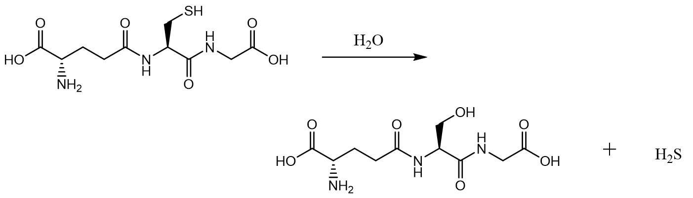 最后還有一個最頭疼的成分——谷胱甘肽,谷胱甘肽溶于水具有強烈的臭味,并不是谷胱甘肽被氧化,而是谷胱甘肽的巰基被水解,生成H2S(見圖15,16),由于H2S的氣味閾值很低,濃度0.00041ppm時就能聞到臭味。其它含硫化合物比如半胱氨酸也很難用。麥角硫因雖然含有硫,但是可以形成硫酮結構(抗氧化(二)——機理),但是加多了依然可以聞到臭味。